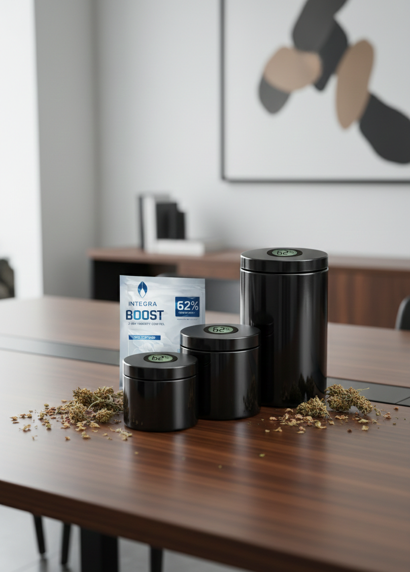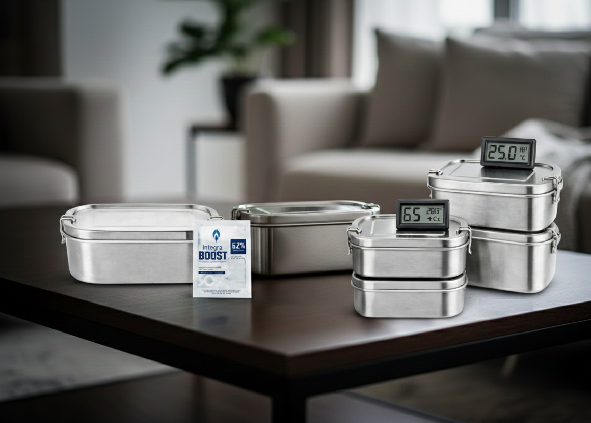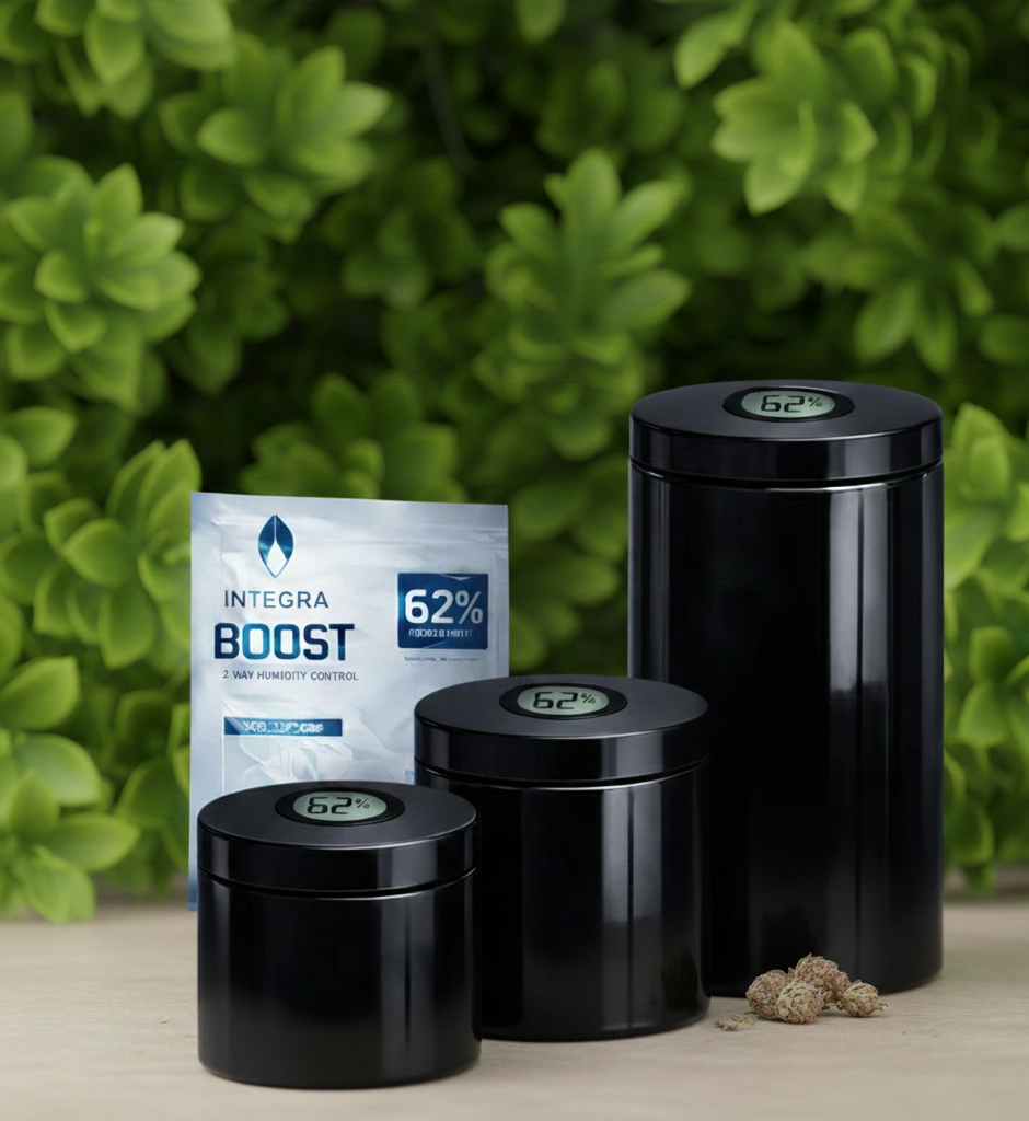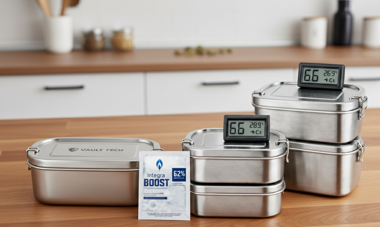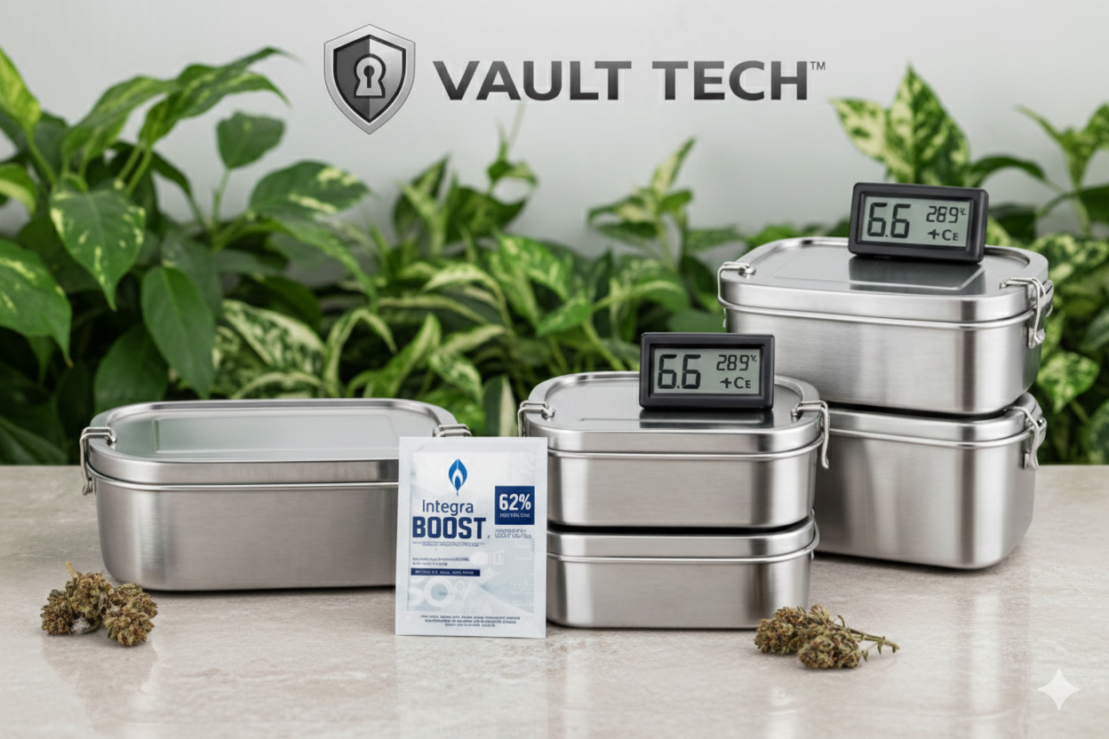 Vault Tech’s airtight stainless steel curing containers come with a digital hygrometer and a free 62% Integra Boost pack to maintain optimal humidity and preserve freshness.